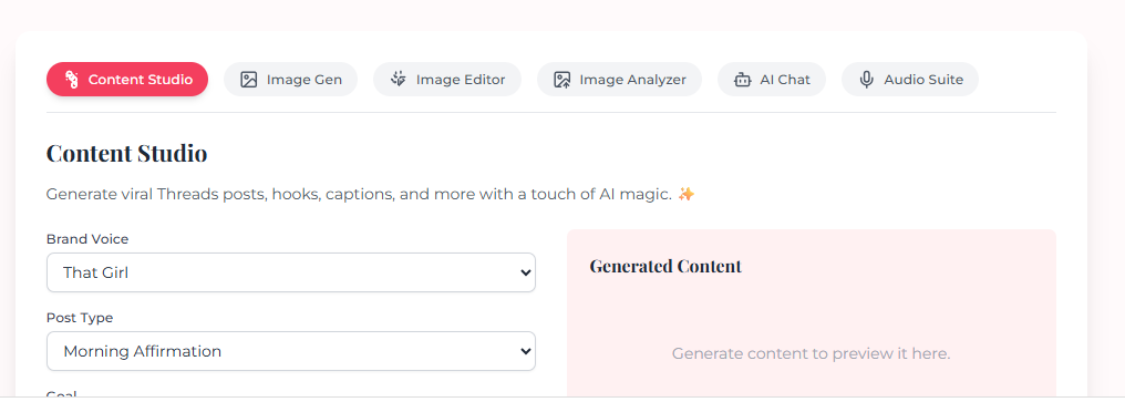 Threadflow Max Studio is an all-in-one content creation app. Create and edit professional images, turn voice into text, schedule posts, and use a built-in AI assistant to plan and write content. One dashboard. No tool hopping. Create faster and stay consistent.